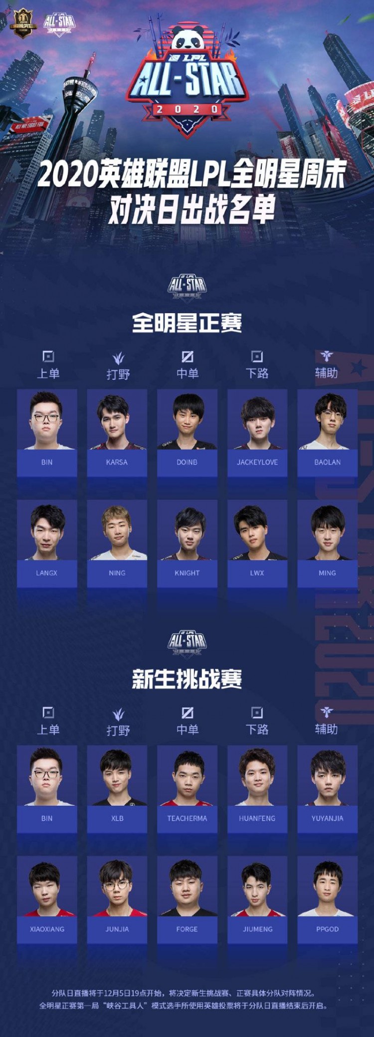 2020LPL全明星周末第一阶段投票已于11月29日晚正式结束,12月12日对决日中的全明星正赛参赛选手、新生挑战赛参赛选手,以及年度最受欢迎主持解说、年度最受欢迎选手现已揭晓。以下为结果详情: