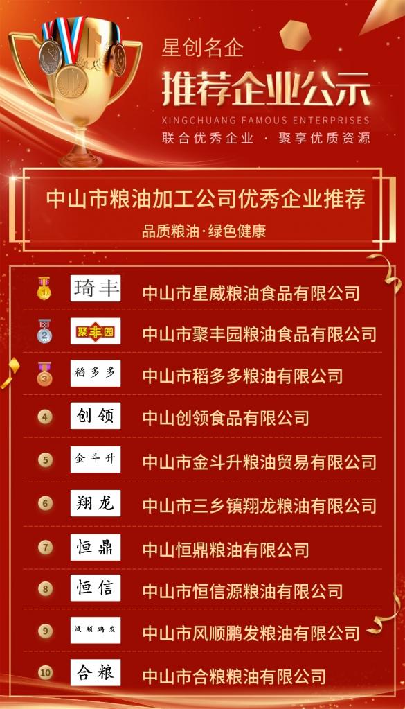 粮油加工业是农业经济的重要参与者,作为农业大国,粮油产业是我国的一个朝阳产业。目前,我国粮油行业正处在一个新的发展时期,粮油加工行业持续增长,出现了速度加快、效益提高、从业人员增加的新局面。粮油是人们的生活必需品,是人们饮食中不可或缺的重要组成部分,粮油是通过系列的生产与加工得到的,粮油加工企业与国计民生以及百姓的生活有着密不可分的关系,但同时也是一种附加值相对较低的行业。为了促进企业健康发展,“星创名企”通过征集广大网友对企业支持数据,选出了中山市粮油加工公司优秀企业,现将对征选结果予以公示: