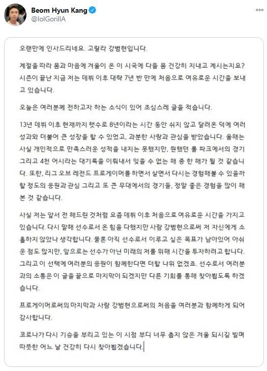 玄冥二老倒了!辅助GorillA在推特上发长文宣布退役2020-12-09 00:10:29 Twitter 12月8日讯今日前KZ战队辅助GorillA在推特上发长