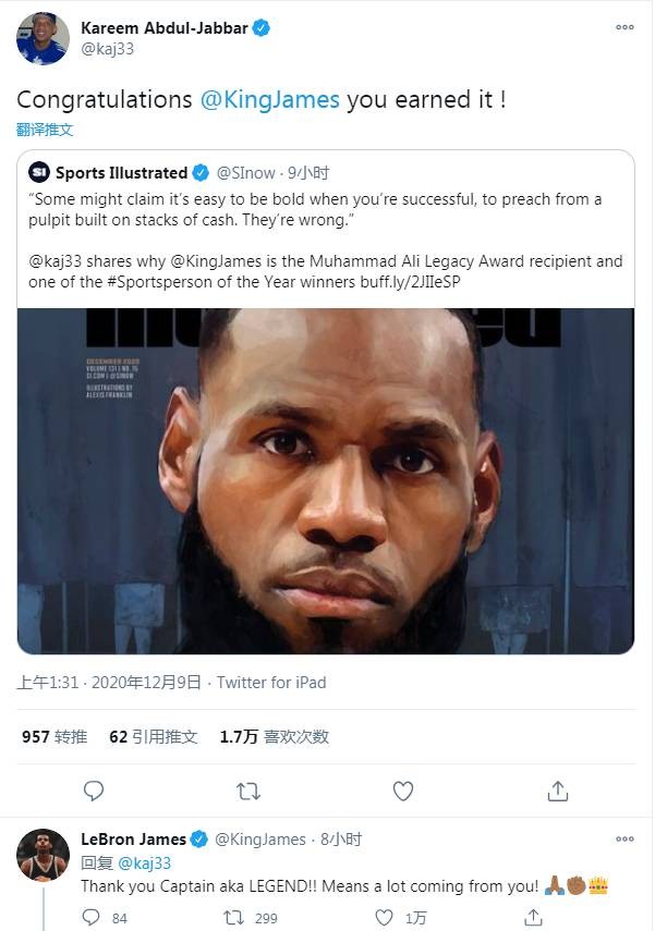 直播吧12月9日讯据此前报道,詹姆斯荣获《体育画报》年度体育人物奖。《体育画报》特地请来了贾巴尔为詹姆斯获奖一事撰文,今日,贾巴尔更新个人社交媒体,转发了这篇文章,并且恭喜了詹姆斯。“恭喜!@詹姆斯,
