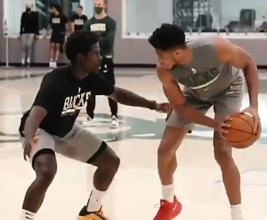 12月9日讯 雄鹿官方今日晒出球队最新训练视频,视频开头190cm的球队新援霍勒迪单防211cm的字母哥,霍勒迪先是用一记抄球将球拍走,不过身高力量更占优势的字母哥随即用一记后仰跳投还以颜色。