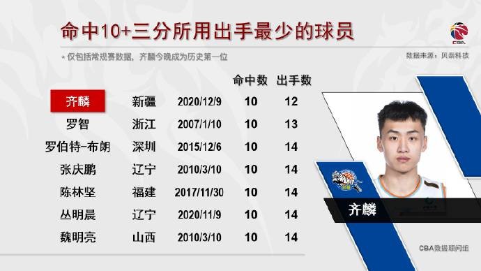 比赛结束后,根据CBA官方的数据统计,仅用12次出手就射进10记三分,齐麟是CBA历史上第一个完成此成就的球员。