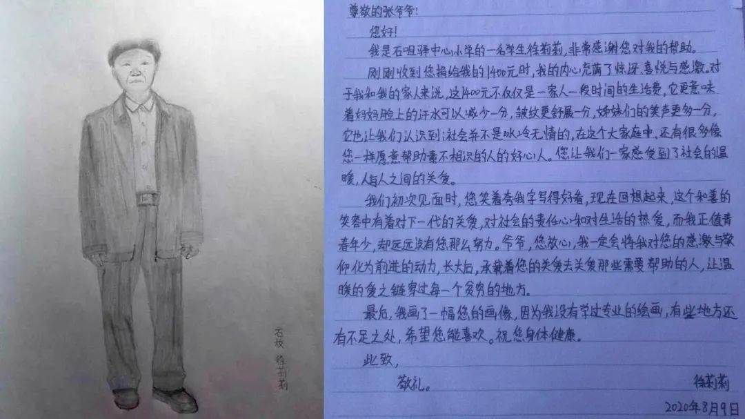 在影片拍摄期间,剧组给每位客串的角色也都发放了生活补助。张炳贵将自己领到的400元“片酬”,后又自掏腰包1000元,总共1400元都捐给了另一位小演员——来自清涧县石咀驿镇中心小学的贫困女生徐莉莉。事后,该女生给张炳贵写了一封感谢信,并亲自画了一张老人的素描像,这让他更加觉得这次参拍电影有纪念意义。事实上,张炳贵平时就乐于助人,经常奉献爱心。如今年新冠肺炎疫情期间,他通过市慈善协会向榆林抗疫一线万元的苹果。