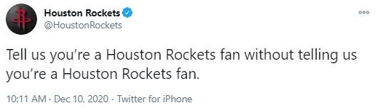 火箭官推:不明说你是火箭球迷的情况下 如何表达你是火箭球迷2020-12-10 10:22:06 Twitter12月10日讯 刚刚,火箭官方更新推特,