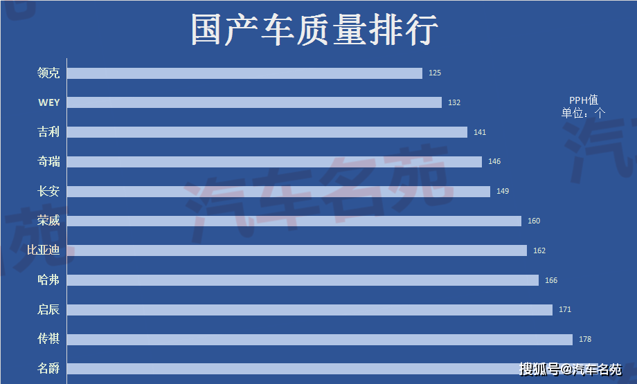 接下来再看下质量排名1-5位的国产车品牌,其中领克汽车夺得榜首,WEY则屈居第二,国产两大高端品牌包揽了冠亚军,而领克汽车和WEY的百车故障数也都是低于140个,这与丰田、本田等一线合资车品牌相比,几乎是旗鼓相当了。另外,排名3-5位的国产车品牌可以说是让人最为满意,它们分别是吉利汽车、奇瑞汽车和长安汽车,这三大国产车品牌都是国人最认可的,而它们的质量表现也确实很出色,榜单显示,吉利、奇瑞和长安汽车的百车故障数都不足150个。