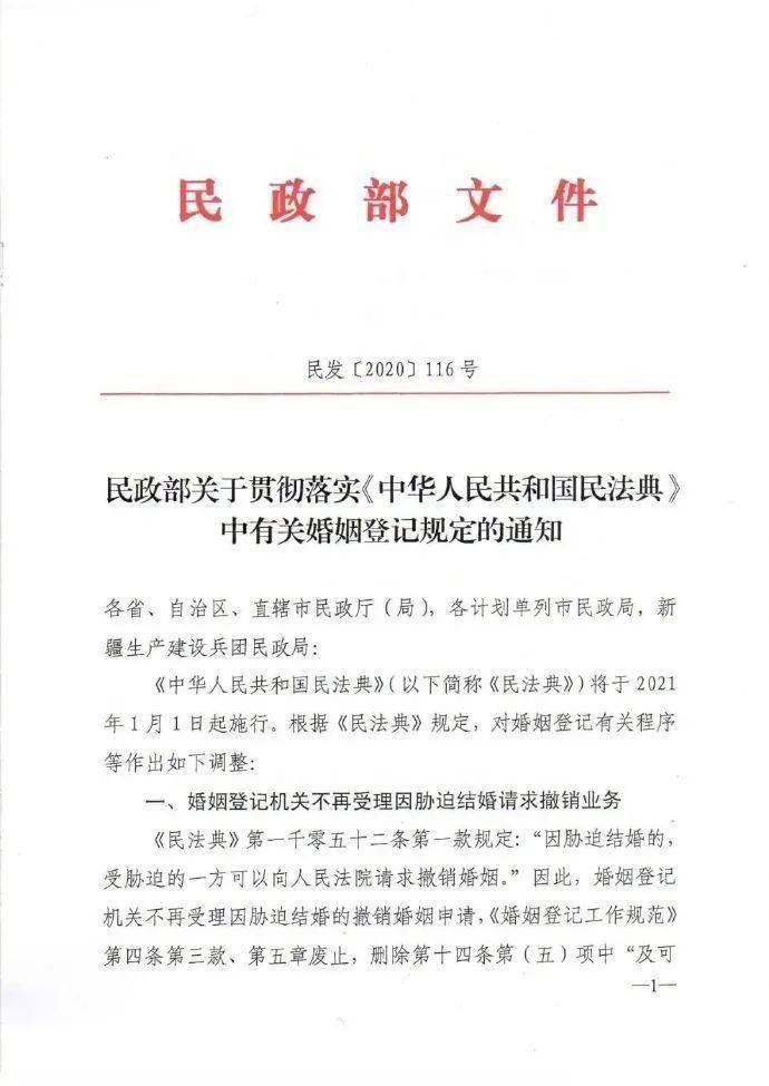 据民政部近日文件,自2021年1月1日起施行,民政局协议离婚的夫妻,需要经过申请、受理、冷静期、审查、登记(发证)五个步骤。届满离婚冷静期后的30日之内,双方需要共同到婚姻登记机关领取离婚证,逾期不领则视为撤回离婚申请。此外,婚姻登记机关将不再受理因胁迫结婚而请求撤销的业务。据《民法典》规定,“因胁迫结婚的,受胁迫的一方可以向人民法院请求撤销婚姻。”