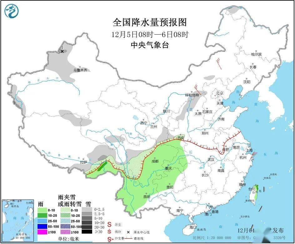 12月5日08时至6日08时,新疆北部和南疆西部山区、甘肃南部、陕西北部、山西北部、川西高原、西藏东部和南部等地部分地区有小雪或雨夹雪,局地中雪。西南地区大部、台湾岛等地部分地区有小雨,局地中雨。内蒙古中东部、浙江东部等地部分地区有4~5级风。