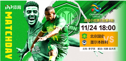 11月24日18:00,北京国安和上海申花将同时出战,分别对阵墨尔本胜利和东京。在首场比赛中,北京国安依靠费尔南多和阿兰的进球,2-1力克首尔取得开门红。前两轮比赛过后,国安两战全胜暂居积分榜第一。此轮的对手墨尔本的战绩则是一胜一负,上个赛季仅获得常规赛倒数第二,阵容较年初已经发生较大变化。只要在两回合的交手中不处下风,国安出线概率非常大。刘腾和孟洪涛将在PP体育为球迷带来本场比赛解说。