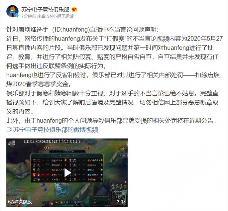 12月10日讯 今日SN官博发布了关于对战队AD选手huanfeng直播时发表不当言论的处罚公告: