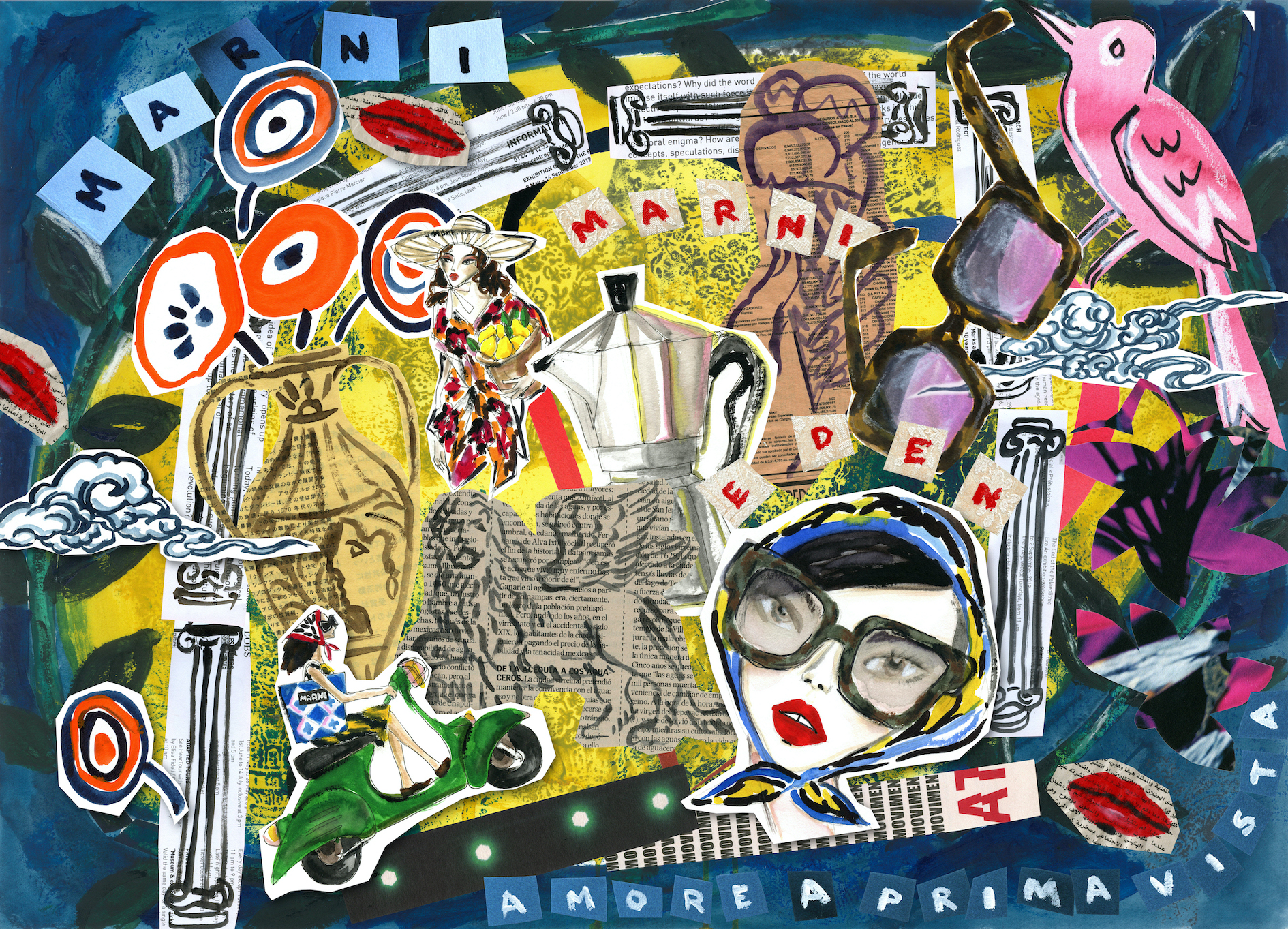 首位插画师从品牌中汲取灵感,创作了一组插画,再现了 Marni 女孩享受户外休闲时光的场景,如驾驶意大利 Vespa 摩托车,或手拎满满一篮阿马尔菲柠檬。他为包袋绘制的插画中还点缀着其他意大利符号,如恢宏大气的罗马柱、庞贝古城的花瓶、经典的摩卡壶以及正在展示 Marni 手册的威尼斯圣马可广场飞狮。