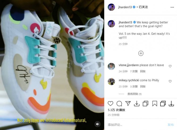 直播吧12月11日讯火箭球星哈登今日更新个人社交媒体,宣传了自己第五代球鞋,并配文:“变得越来越好!这是我们的目标,对吧?Vol.5一月四号发售!准备好了吗?他来了!”不过很多球迷似乎并不在乎球鞋,他