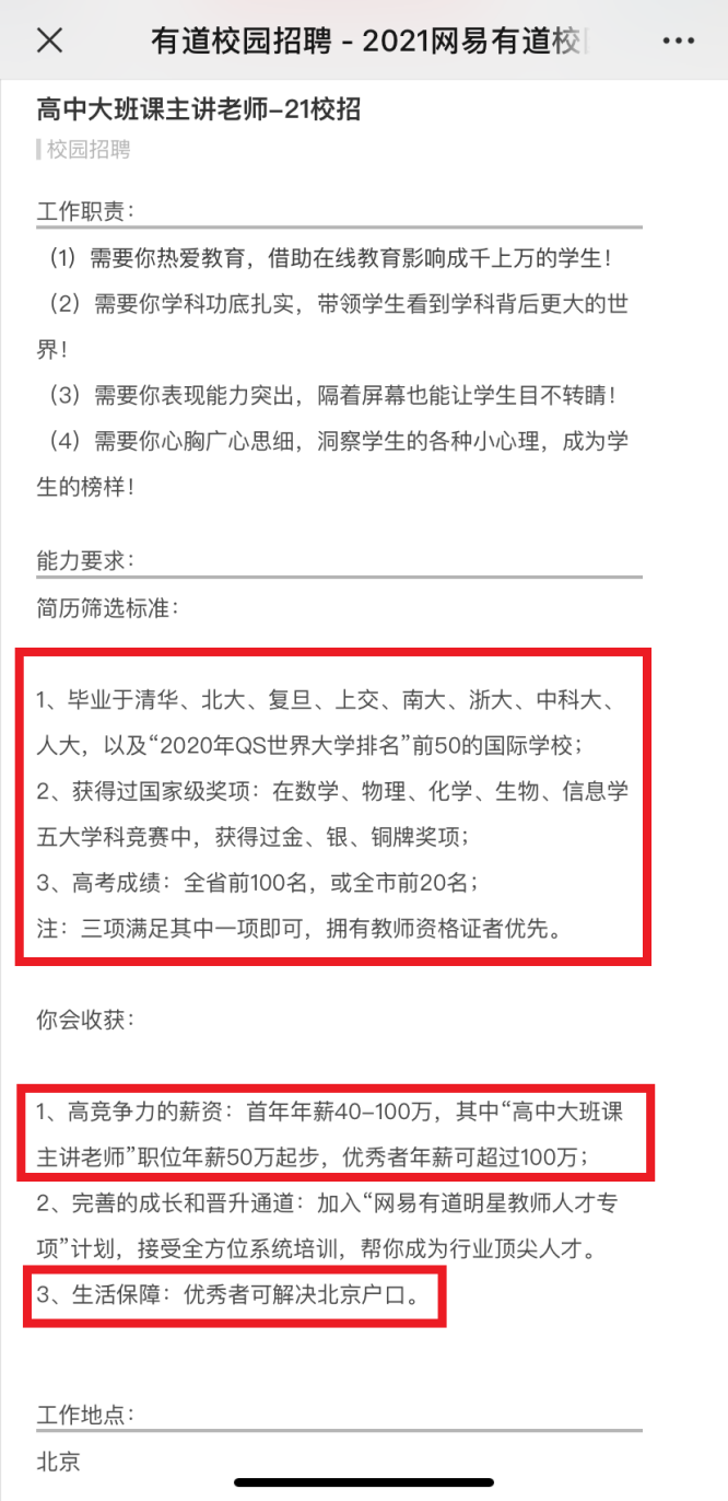 今日,网易有道旗下K12网校有道精品课发布2021届校招职位,面向知名院校优秀毕业生招聘网课主讲老师。其招聘页面显示,“高中大班课主讲老师”职位年薪50万起步,其中的20%年薪可超100万;K12小初学段主讲老师薪资在40-100万之间。
