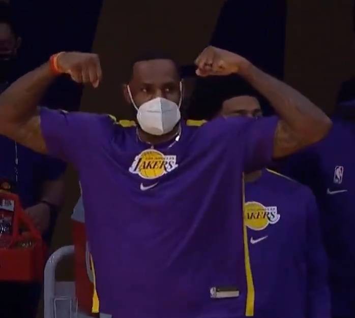 比赛中,湖人小将霍顿-塔克强突肯纳德,并用力量扛开对手上篮命中,替补席上的詹姆斯也起立为小兄弟叫好。