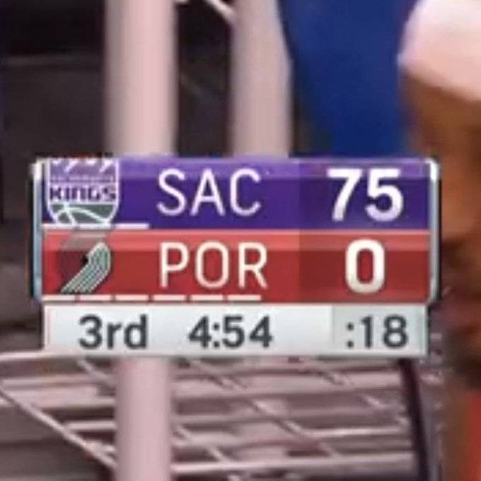 直播吧12月12日讯NBA季前赛,国王以102-127不敌开拓者,未能收获开门红。比赛进行到第三节还剩4分54秒时,记分牌显示国王75-0领先开拓者(应该是76-90)。国王官推转发图片,并写道:“停