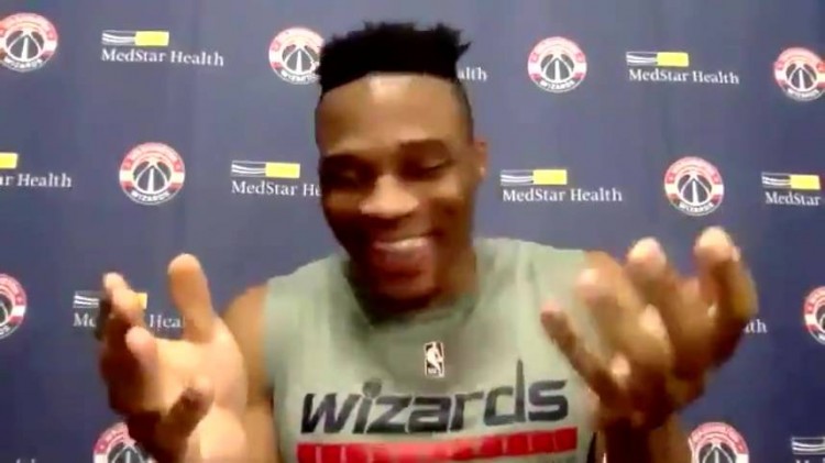 直播吧12月12日讯奇才球星威少今天接受了记者采访,由于疫情,本赛季的采访多以视频群聊的方式进行。今天,记者TroyHalibur的WIFI质量太差,导致他的问题完全没能被听清,威少也是在懵逼地听了一