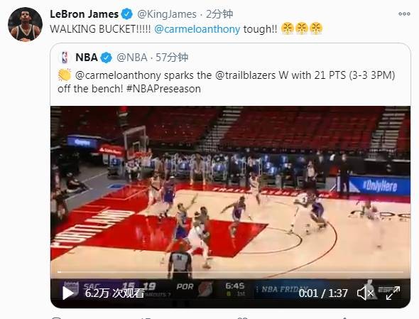 直播吧12月12日讯开拓者以127-102战胜国王,NBA官方晒出了安东尼的本场集锦。正在网上冲浪的好友詹姆斯转发并写道:“行走的得分手!@安东尼,强硬!”此役安东尼出战23分钟,全场13投8中(三分