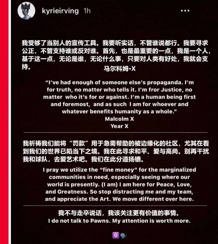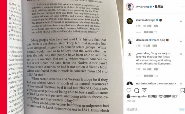 如果你去看欧文发的Instagram,可以发现从去年10月开始,他发的内容发生了很大的改变。以前,他像别人一样,经常晒一下鞋,发一下打球的照片或视频,在中国和球迷互动,或者宣传德鲁大叔的电影。但是在10月19日那天,出现了一本书。