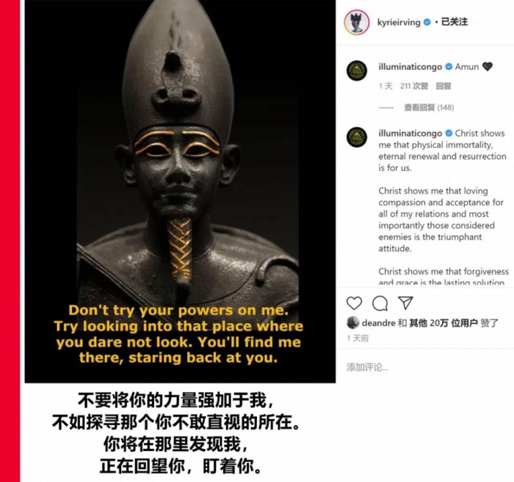 就在一天前,欧文在社交媒体上又晒出了一张高内涵图片,并配文道:“不要将你的力量强加于我,不如探寻那个你不敢直视的所在。你将在那里发现我,正在回望你,盯着你。”