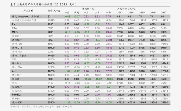因此,我们将我们对夏季投资要点换行一周涨幅较大的产品:丙烯腈长三角,9.1%;乙烯韩国FOB,8.2%;苯胺华东,6.1%;苯酐华东,6.0%;环氧树脂华东,E51,5.3%。