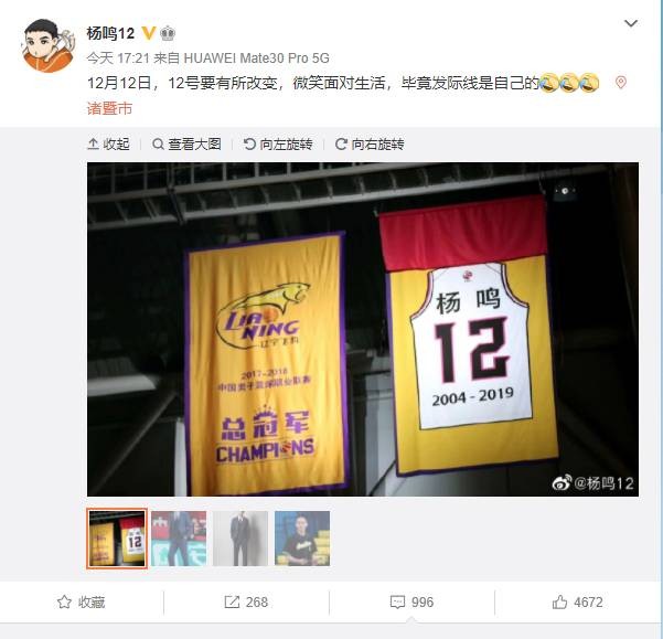 直播吧12月12日讯今天是12月12号,辽宁主帅在微博晒出了自己被退役的12号球衣。“12月12日,12号要有所改变,微笑面对生活,毕竟发际线是自己的……”杨鸣写道。杨鸣此前和刘维伟有过隔空互相的调侃