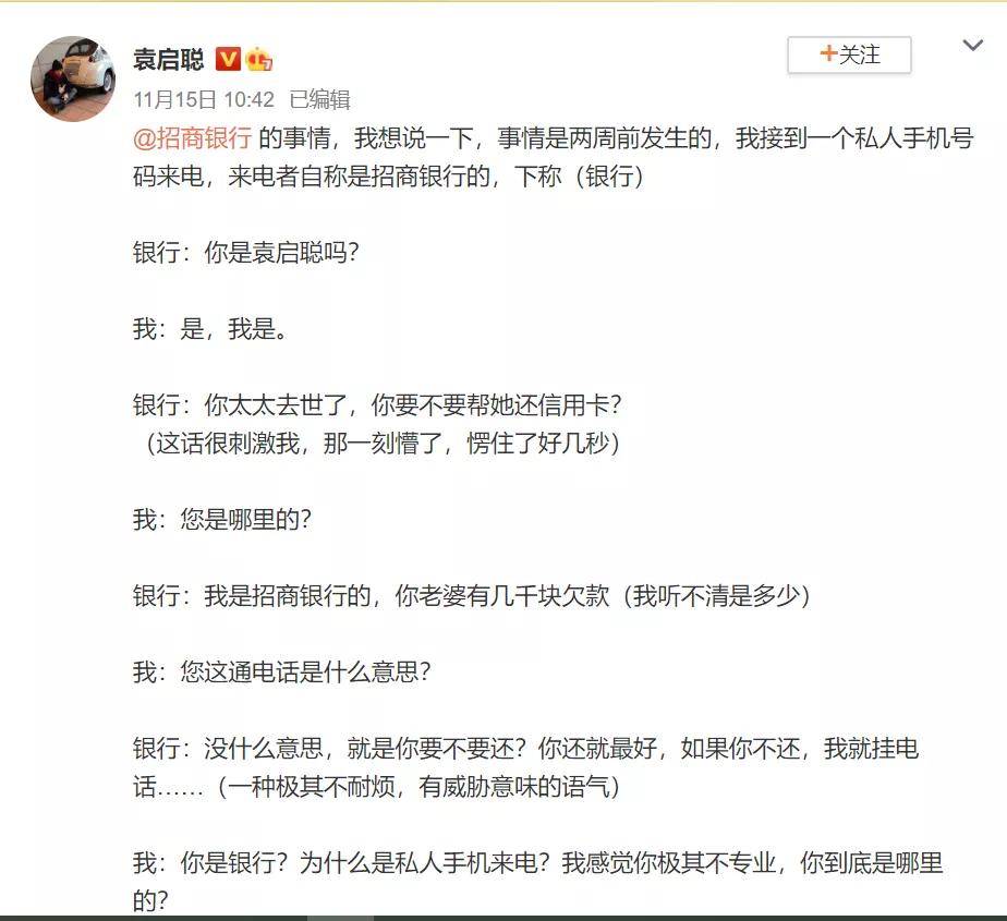 一名大V袁某发布微博称,在其妻子刚去世不久,一个陌生电话便打电话过来,口气粗暴地要求他替刚去世的妻子偿还信用卡欠款,来电者自称是招商银行,但在询问后得知是一家“收数公司”。袁某认为,招商银行未经自己允许,把个人隐私信息透露给第三方“收数公司”,银行应当给予相关说明,招商银行对此事进行了回应。