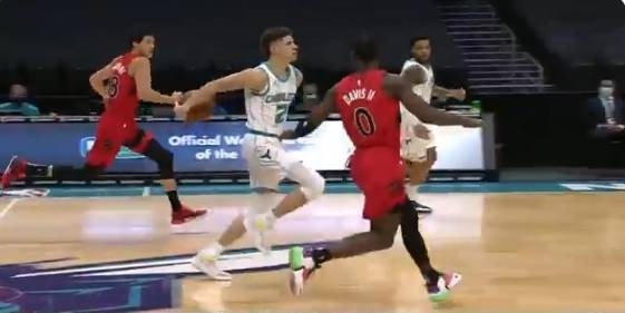 第三节还剩5分56秒时,三球拉梅洛-鲍尔奉献了一次精彩的助攻,他行进间送出一记恰到好处的背传,准确找到了空位的布里奇斯,后者上篮打进。