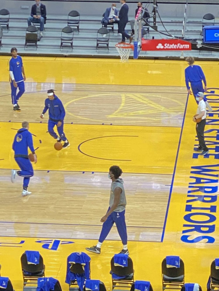 直播吧12月13日讯勇士稍后就将迎战掘金,双方球员目前已经在球场上热身。本场比赛,半个月前确诊新冠、至今还不能参加合练的怀斯曼将坐在场边观战,在队友热身时,怀斯曼也是戴着口罩站在篮下和场边。(史蒂夫盖