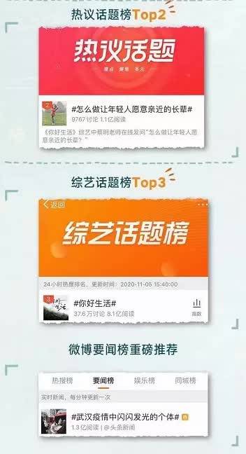 同时,话题#武汉疫情中闪闪发光的个体#在微博热搜榜置顶,要闻榜第 6 位,总阅读量1.4亿,#孩子出生时撒贝宁发的第一条微信#登微博热搜第1位,娱乐榜第1位,总阅读量7.1亿,话题#央视主持人接力新闻播报##点读机女孩已经上大学了##你愿意重返校园吗#均登微博实时上升热点第1位, #怎么做让年轻人愿意亲近的长辈##真实和完美哪个更重要# #李梓萌说自己很不完美#这些直戳人心的社会话题也依然恰如其分的出现在第二季《你好生活》中,它带着为“总台IP年轻化”踏路的责任而来,又始终不忘传递正向价值观的使命,在广阔天地,陪伴观众寻找生活的意义。