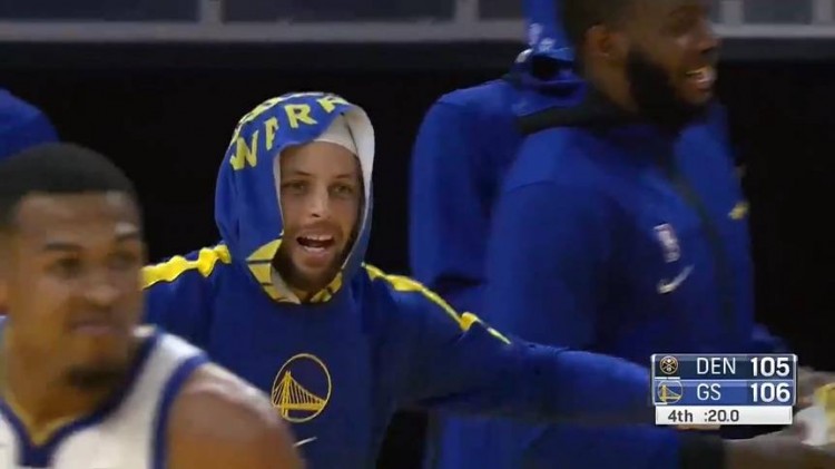 比赛最后20秒时,掘金落后1分,波尔手握两罚,有反超的机会;在他错失了第一罚之后,库里在场下带着队友们对波尔进行干扰,库里做出了“卡位抢板”的姿势给波尔施压,之后还转身想要调动不存在的观众。