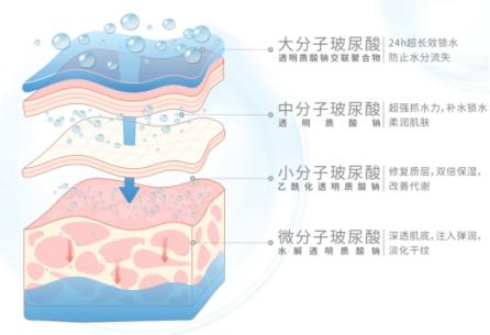 市面上补水产品很多,但是传统补水产品,大多是单一分子量的成分,很难深入肌底层。由于皮肤是层级结构,每一层的需求与空间密度都不一样,所以单一分子量的补水成分只能停留在肌肤表层。