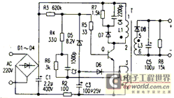 另一路经L2耦合输出负反馈电压,此负向反馈电压经C2、R6、R4、R5加至Q基极使Q截止;高压直流再经R3、R5使Q管导通,L3再次输出脉冲电流,新一轮电磁感应使L2负反馈电流再次经原路使Q管截止。电路财而复始地变化使电路产生持续振荡,L3持续输出直流供电。