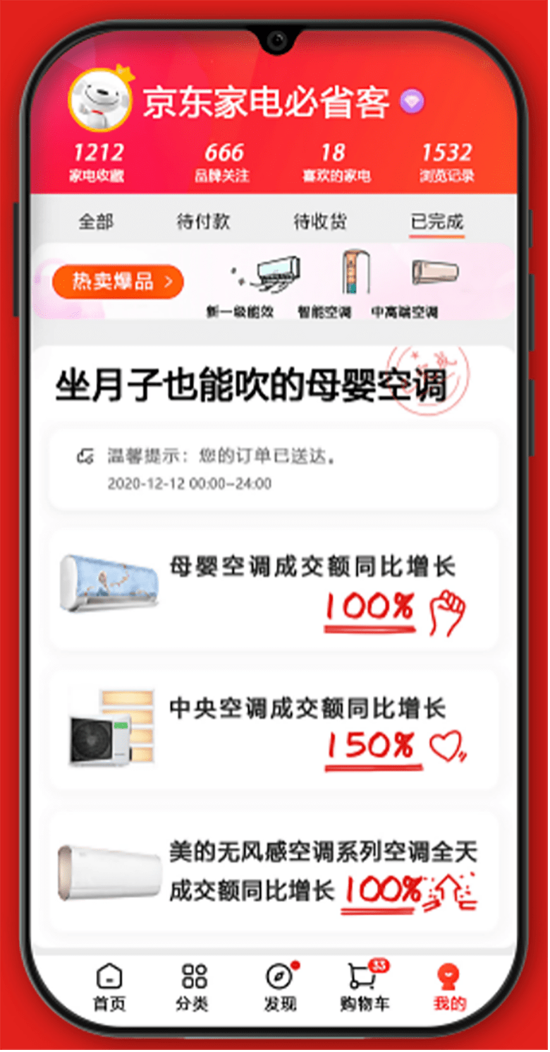 空调追求无风感,小范围控温“出圈”全屋换气。现在买空调大家都知道除了控温速度,健康更重要。京东家电12.12销售数据显示,具备呵护母婴人群、主打柔和风的空调产品备受青睐,比如坐月子也能吹的母婴空调成交额同比增长100%,像美的无风感空调系列产品全天成交额同比增长100%。除了常见的以房间为单位小范围控温的空调,在全屋换新空气、保持健康空气流通的需求下,中央空调成交额同比增长150%。可见,空调产品今后的研发方向已经从单一的温度调节升级为全屋健康空气打造系统。
