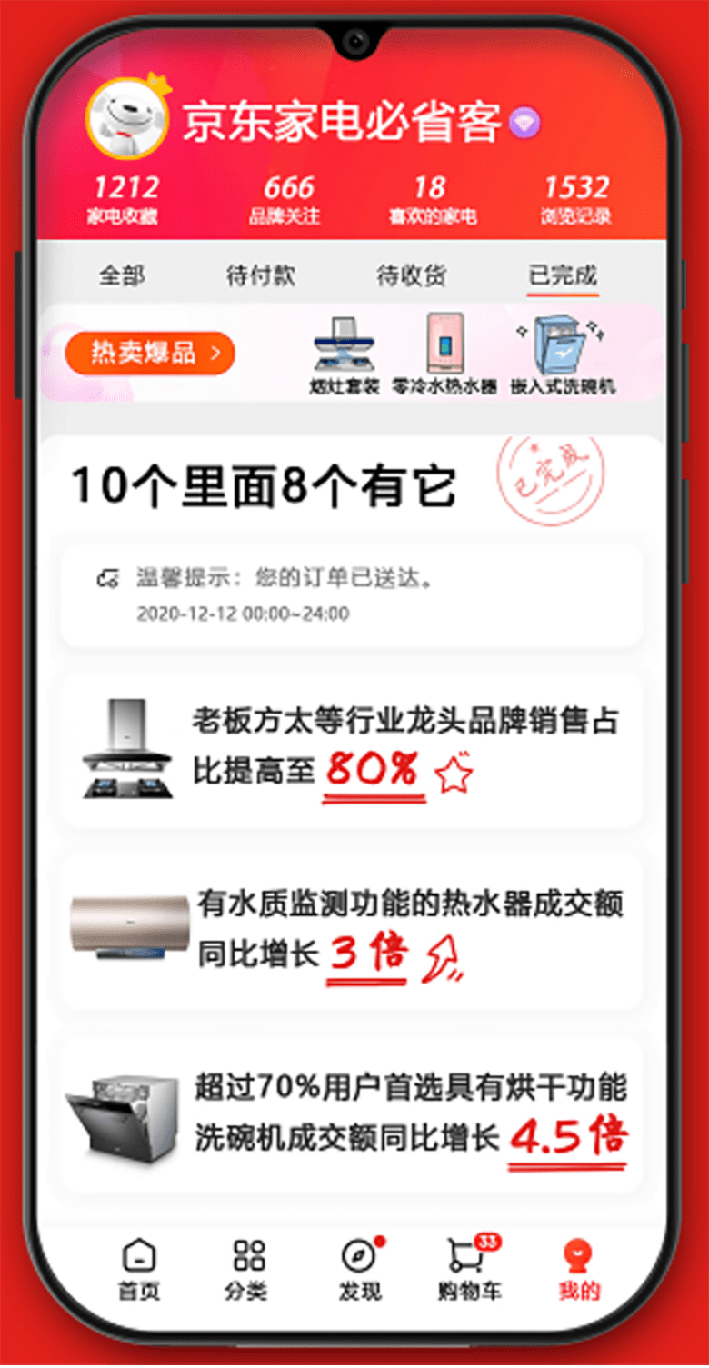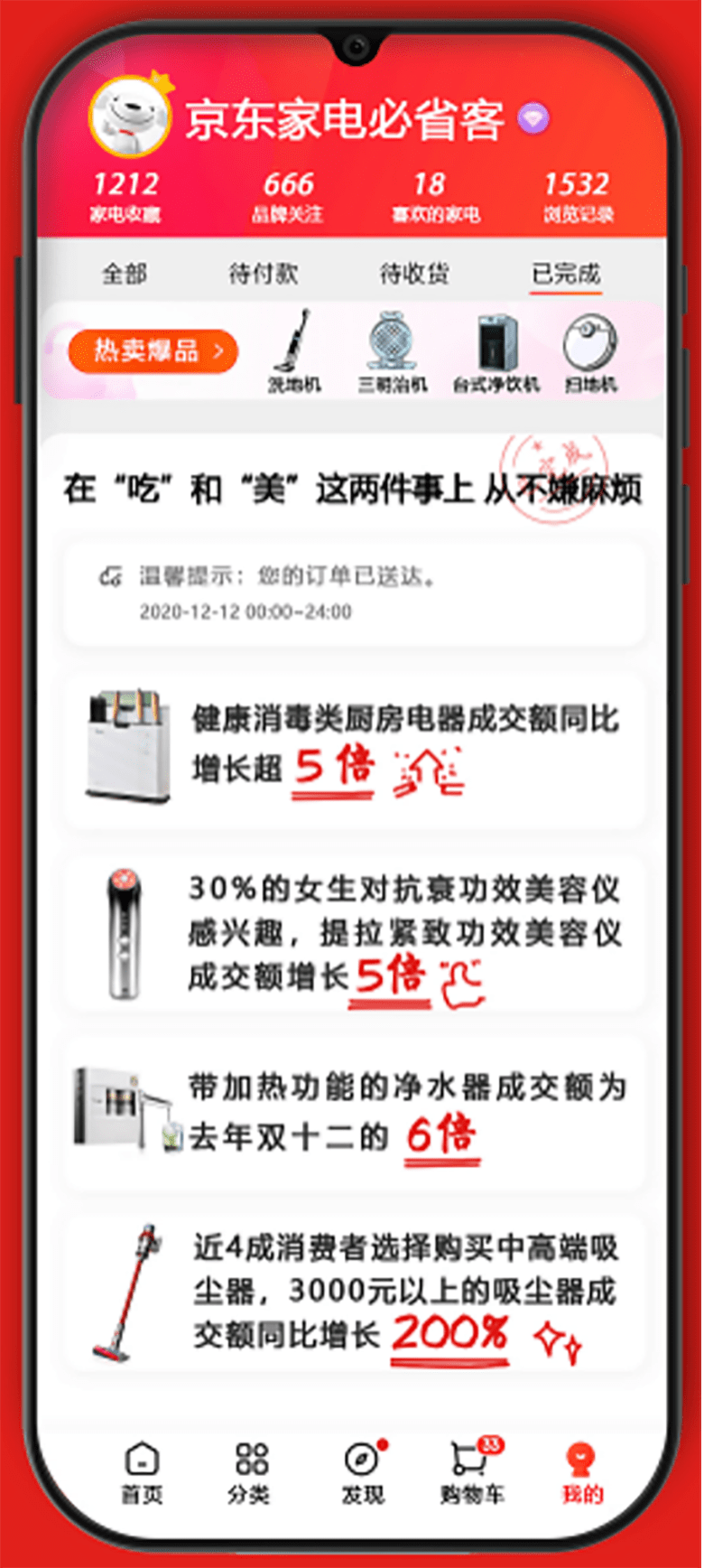 Donews 12月13日消息(记者 丁凡)在品类细分多元化拓展、产品功能人性化创新的市场迭代下,家电消费已经从为解决基本使用需求升级到实现高品质生活体验的阶段。这一消费趋势在今年京东12.12年终好物节家电战报中得以体现,在各品类家电热卖背后,可以看到受到广大消费者热捧的都是具备创新科技、能治愈生活的各类“出圈”产品。