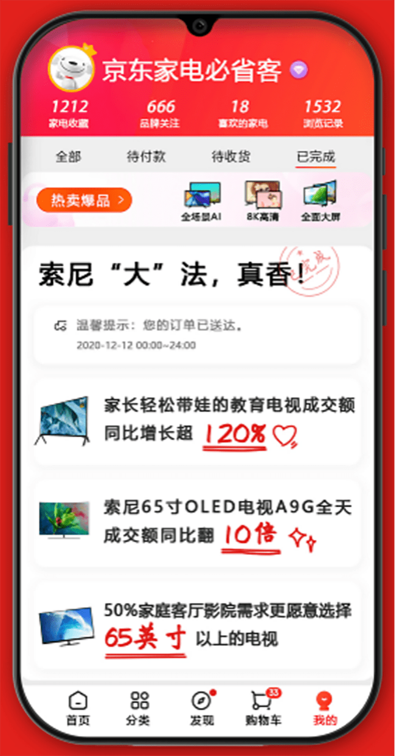 电视出圈教育界,“寓教”“娱乐”一屏搞定。论现在的家长有多难,不按套路出的小学题也有可能难倒研究生。京东家电12.12销售数据显示,有海量教学内容、能让家长轻松带娃的教育电视成交额同比增长超120%。同时,作为客厅娱乐的首选,50%家庭为打造客厅影院更愿意选择65英寸以上的电视,一款索尼65英寸OLED电视A9G全天成交额同比翻10倍。能学能玩能做一切的新时代电视,正在重新成为客厅的“主角”。