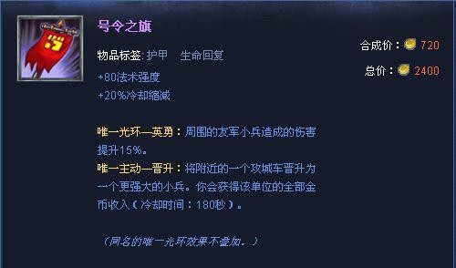 这件装备最吸引人的就是他的主动技能可以与当时版本的大龙BUFF叠加,轻易地把小兵变成“超级兵”,让劣势方无法处理兵线问题。在当时的版本中这件装备几乎是带线神器,可惜因为太过强大,在之后的几个版本都被拳头削弱,直至删除。