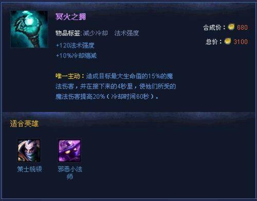 在冥火之拥还未被删除的那个时代,几乎成为了高爆发法师必出的装备;尽管这件装备被拳头多次改版,但是它的主动技能依旧强势,最后在S5的时候被删除。