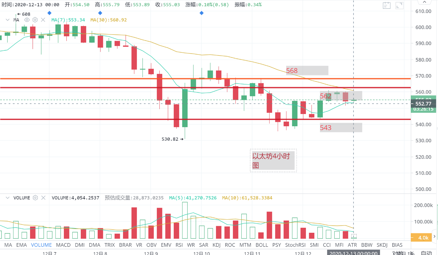 以太坊走势上,当BTC再次探低点反弹时,ETH却没有创新低,主要原因来自于主力的加仓和市场的叫好情绪。ETH在4H周期中枢低点530左右行成确认性的底部位置,底部量能较为充足,短期内4H周期下跌有止跌的态势,而反弹能否到达570以上决定着行情能真正迎来反弹,显然目前的趋势只是大幅下跌之后的小抵抗性的反弹,并没有扭转下跌的趋势。还是那一句下跌不是一天完成的,上涨也不是一天可以完成的。当前上方阻力同样是30均线位置