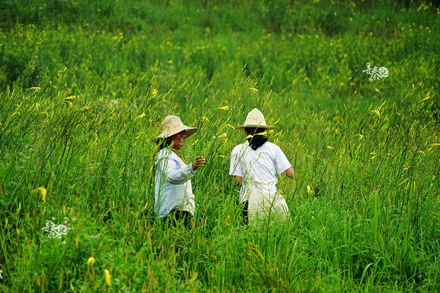盛夏七月, 在瀛湖乡情种植园里,漫山遍野的黄花菜青翠欲滴,长势喜人,桔黄色的小花热烈地开放着。采摘工人们戴着草帽、口罩,臂垮竹篮,双手上下翻飞,一根根金黄色的嫩芽迅速落入篮中,散发出淡淡的香味。“我在家闲着也是闲着,反正没什么事干,每天来这里打工最低还能赚100多元,就像是捡金子一样,幸福得很呢。”采摘工人唐家翠说。