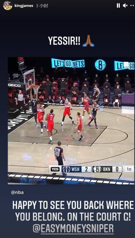詹姆斯更新社媒动态,转发KD复出第一分的视频,并写道:“YESSIR!!