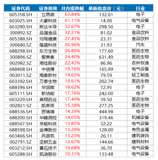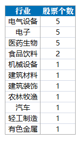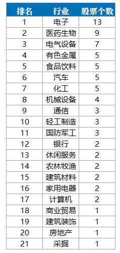分行业来看,属于电气设备、电子、医药生物的个股均有5只,数量排名并列第一。属于食品饮料行业的个股有2只。