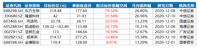 其中,东方生物涨幅空间近80%,该股今日收报177.6元,中信证券在12月8日发布的研报中给出了高达318.48元的目标价。