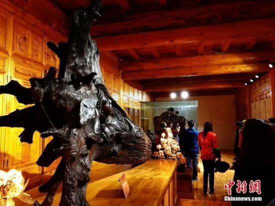 4月26日,青海省规模最大的民间博物馆——青海永录民俗博物馆正式开馆迎客。据悉,该馆分乌木艺术精品馆、金丝楠木艺术精品馆、中式家具文化精品馆、千佛殿、河湟民俗文化馆等展区,展出了大量乌木和金丝楠木等珍贵材质的雕刻艺术品及家具。图为馆藏的木质雕刻艺术品。中新社记者 张添福 摄
