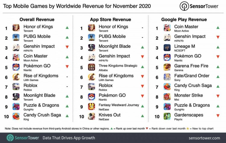 12月14日讯 统计网站Sensor Tower近日发布了最新报告,为玩家们分享了2020年11月全球热门移动游戏收入榜单,其中《王者荣耀》再次夺回第一的成绩,《原神》则下跌至第三。