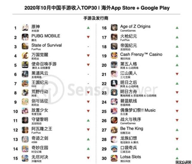 以下为本年度10月份中国手游海外收入榜其中原神10月在手游市场一骑绝尘,强势登顶10月份海外收入榜首位;1、原神2、绝地求生手游3、生存防御战4、万国觉醒5、使命召唤手游