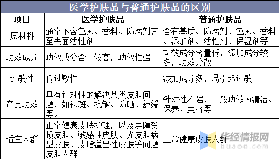 医学护肤品相比普通护肤品更强调专业性和安全性,具有功效性强、过敏性低、非健康皮肤也可用、能解决特定皮肤问题的特点。医学护肤品又称皮肤学级护肤品、功效护肤品、药妆品等,这一概念最早由Raymond E.Reed在1962年提出,用于描述具有活性的或者有科学根据的化妆品。