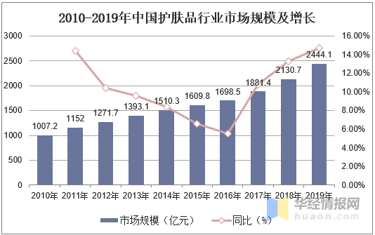 市场规模方面,作为化妆品行业中最大的子行业,2019年我国护肤品市场规模达2444.1亿元,占化妆品整体市场51.2%的份额,2014-2019年复合增速达10.1%,略高于化妆品行业整体增速。