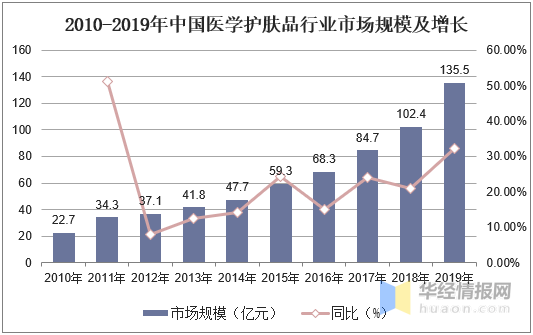 受空气、环境、压力等多因素的影响,我国人群中肌肤敏感等皮肤问题发生率也在逐渐提高,据统计我国医学护肤品市场2019年市场规模达135.5亿元,2014-2019年复合增速达23.2%,远高于化妆品市场和护肤品市场的整体增速。