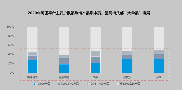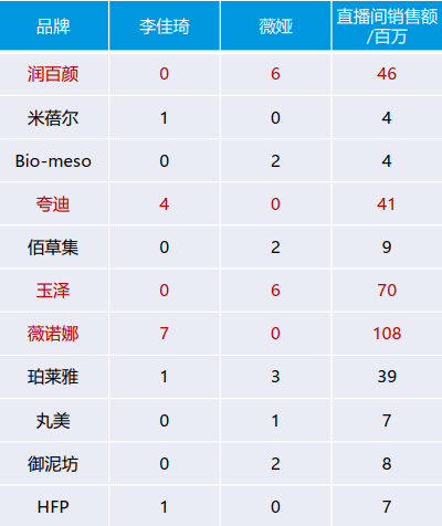 ▍2020年双十一周期部分护肤品牌直播带货数据(数据来源:公众号-根号C,标红为直播销售占比超过50%的品牌)