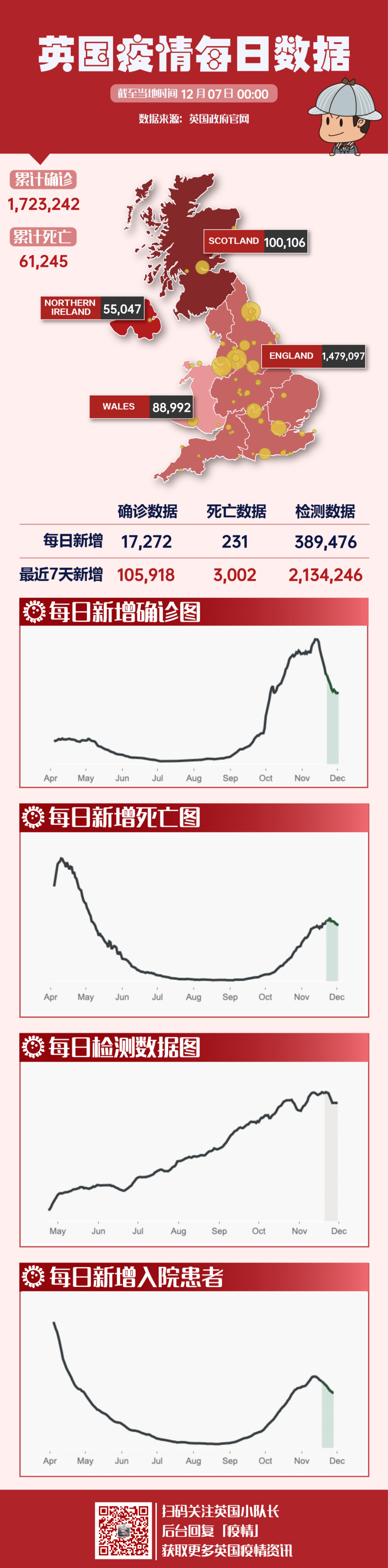 截至当地时间12月7日,英国单日新增确诊17272例,累计确诊1723242例;单日新增死亡231例,累计死亡61245例。
