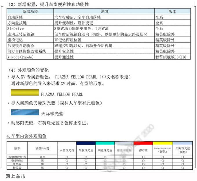 XV)全系增配自动落锁、方向盘按键以及SI-Drive(S模式动力更强,且省油),除精英版外升级了连动反转后视镜、座椅记忆、后视镜折叠以及前方盲区影像监测系统,顶配智擎旗舰ES增加了X-Mode,动力上没有发生变化。